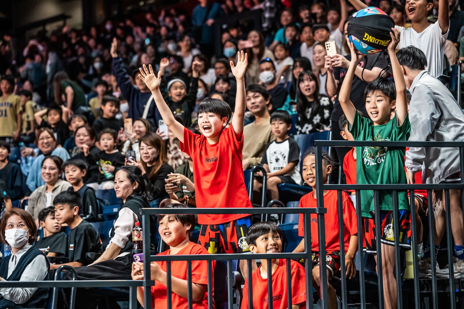 また、男子日本代表チームコーチによるミニクリニックを実施しました。クリニックには、沖縄市内の男女中学生12名が子どもたちを代表して参加し、約2,000人の観客が見守る中でドリルに挑戦しました。