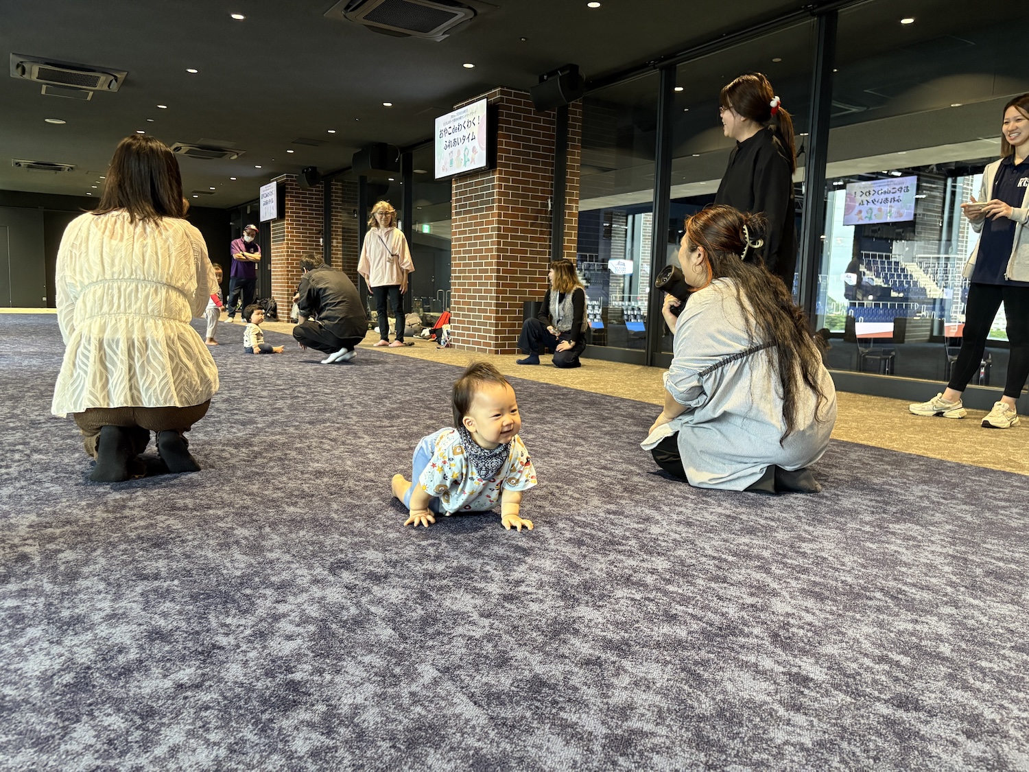 4Fラウンジを全面開放し、マットやボールなど乳幼児用の遊具を揃えて、親子が安心して参加できる空間を整えました。