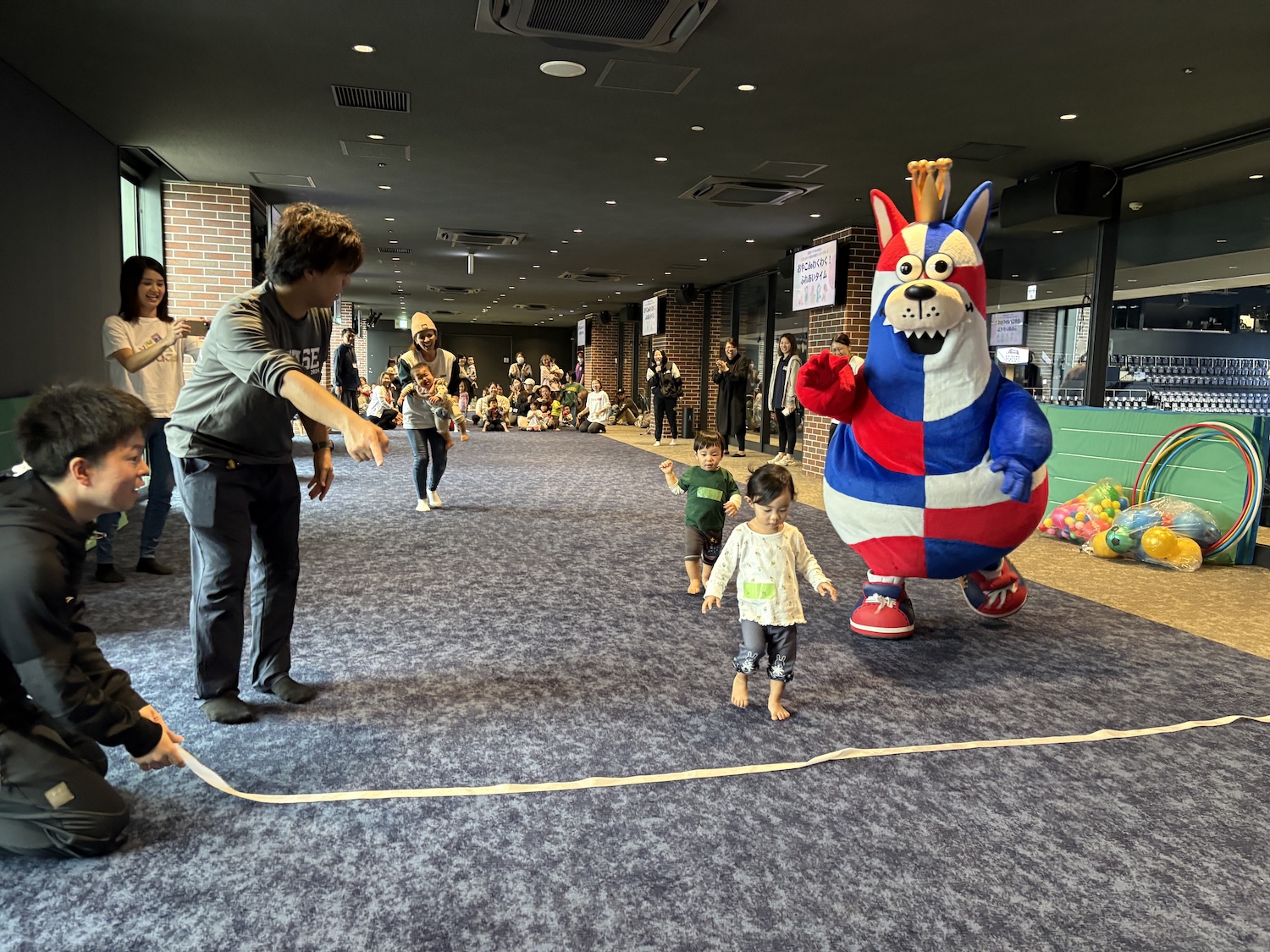 子どもスポーツ教室はサブアリーナで実施していますが、乳幼児の安全面・保護者の動線・ベビーカー利用などを考慮し、今回は初めて4Fラウンジを“親子のための運動空間”として活用し、アリーナの新しい活用モデルとしても大きな意味を持つ取り組みとなりました。