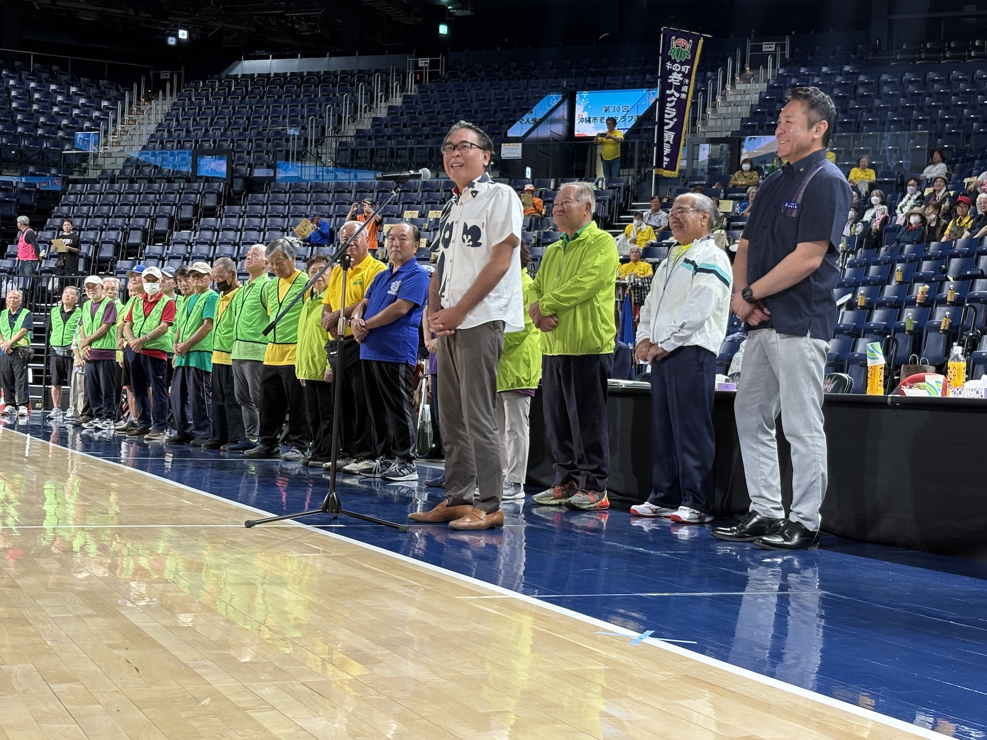 開会式には、新里八十秀 沖縄市老人クラブ連合会会長、花城大輔 沖縄市長、瑞慶山良一郎 市議会議長に加え、