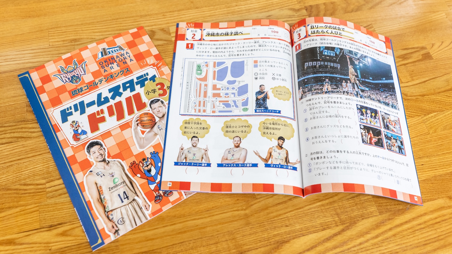 「ドリームスタディドリル」には、キングスの選手やマスコットが登場し、国語・算数などの基礎学習に加え、沖縄市の文化や歴史、地域資源を学べる内容を収録しています。
